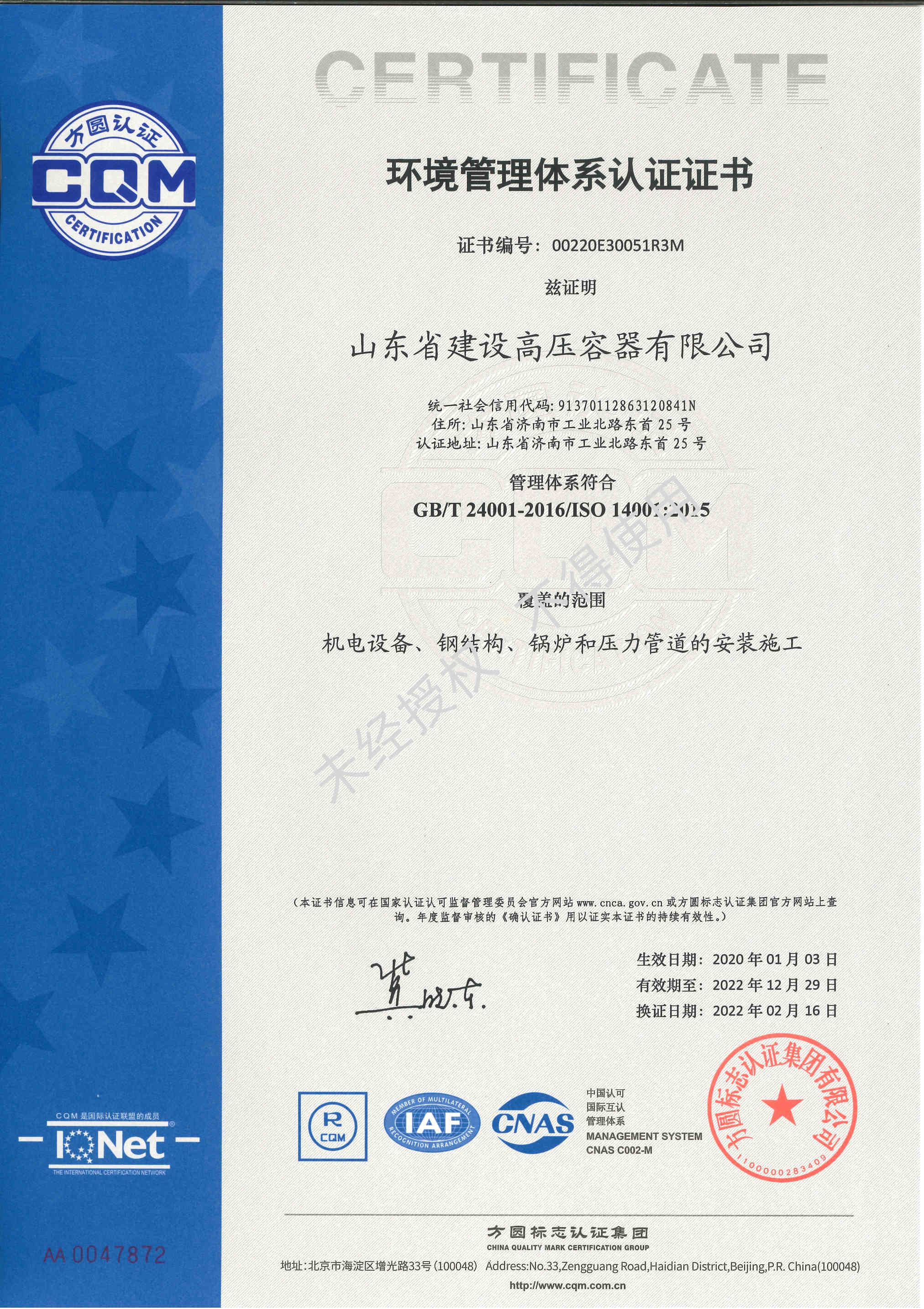 环境管理体系认证证书
